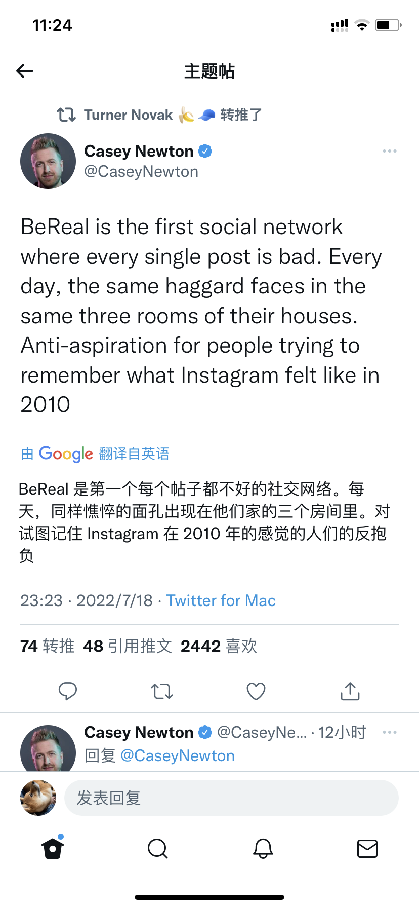 Casey的评论像极了gay的语气(mean但精准)。一年之后再次试用,发现相比BeReal,抖音随拍反而更好玩。