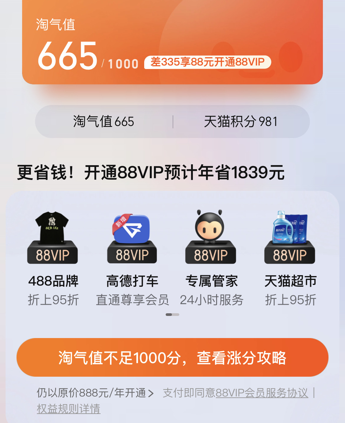 就我个人而言,18年作为明显的分水岭,慢慢从淘宝转移到拼多多,和无法开通88vip是有一定关系的,淘气值也从之前非常接近开通条件的950左右跌落到了现在的665。