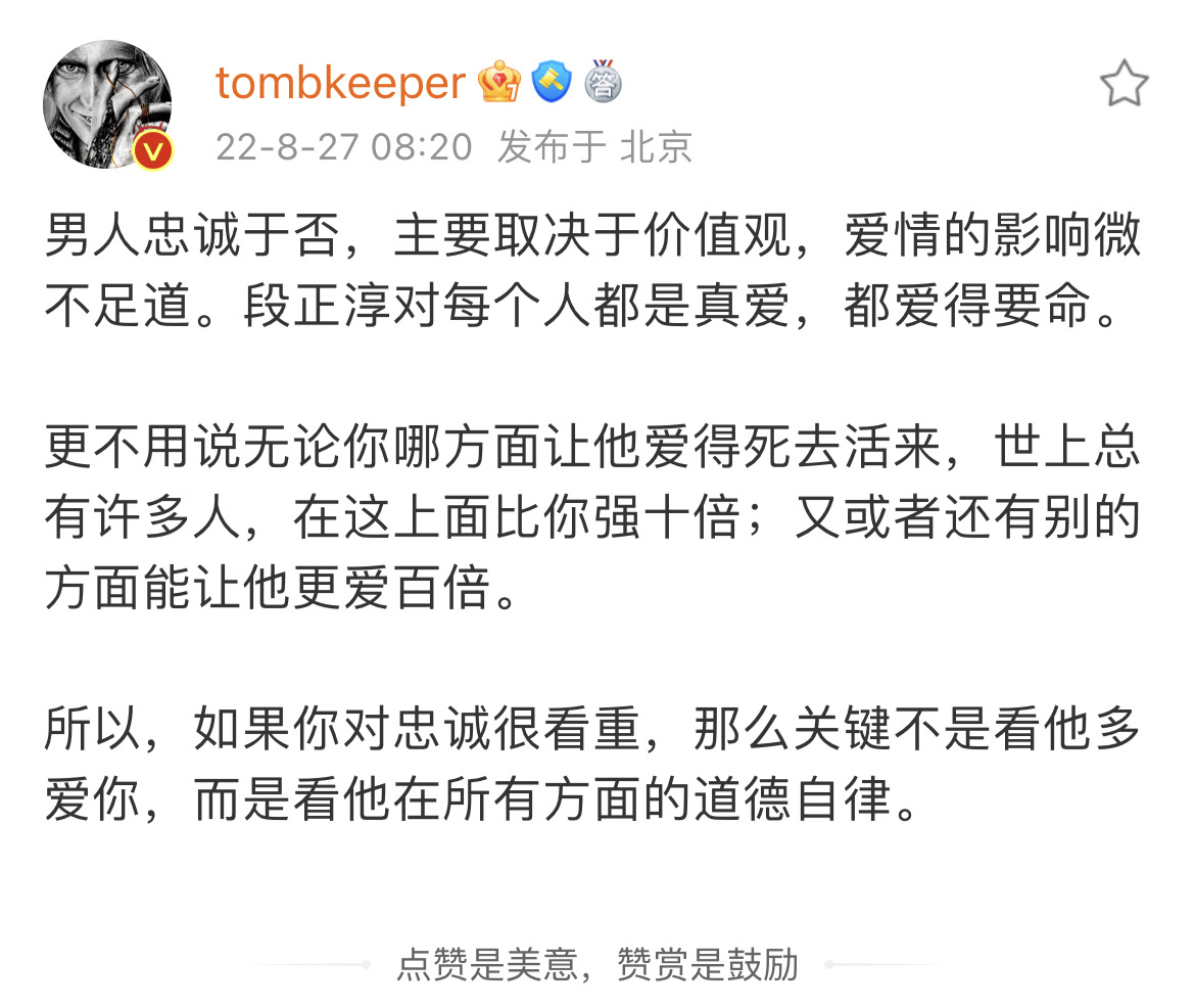 这是我非常赞同的一个观点。伴侣忠诚完全取决于人品和道德自律。