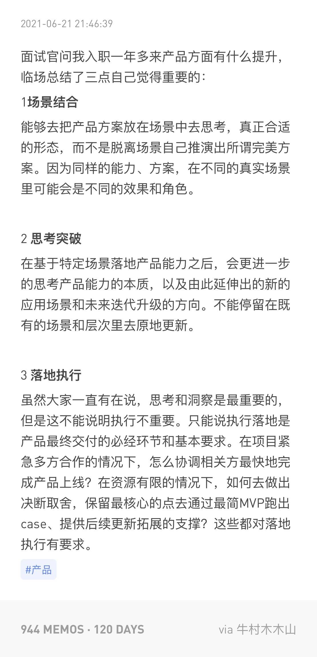 面试官问我入职一年多来产品方面有什么提升,临场总结了三点自己觉得重要的:
