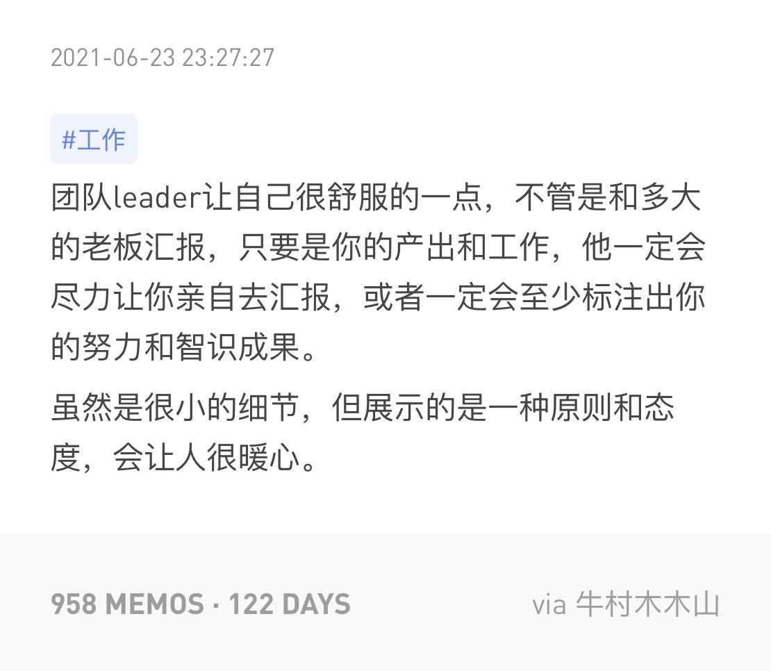 团队leader让自己很舒服的一点,不管是和多大的老板汇报,只要是你的产出和工作,他一定会尽力让你亲自去汇报,或者一定会至少标注出你的努力和智识成果。