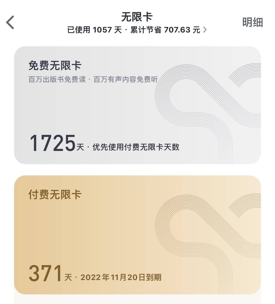双十一的时候带着 1700+ 多天的免费无限卡冲了微信读书付费无限卡。