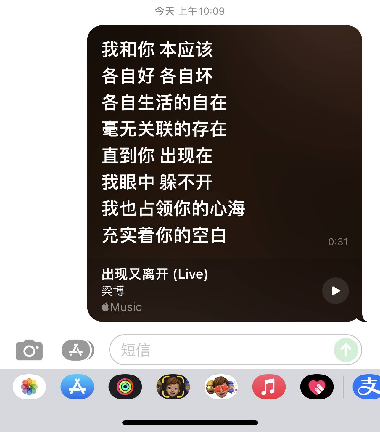原来 music的歌词分享体验这么酷,选择好要分享的内容通过iMessage分享后,对方可以听看歌词外,点击听分享的片段[爱心]可惜苹果社交做得一塌糊涂