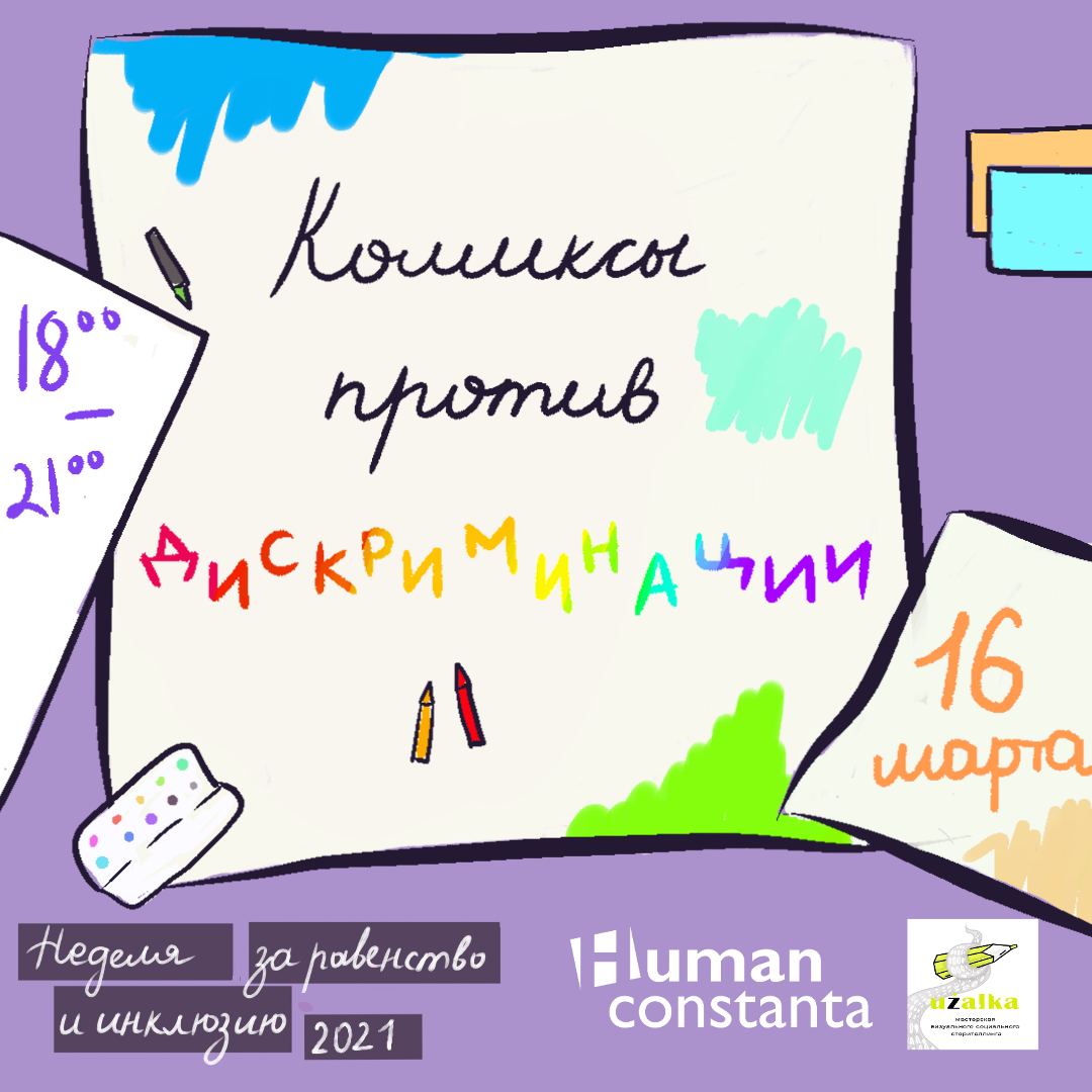 - 16 марта (вторник) 18:00-21:00 — онлайн воркшоп «Комиксы против дискриминации» от Лены Немик — Рисовать истории и делиться ими — это легко, весело и немножко меняет мир к лучшему.