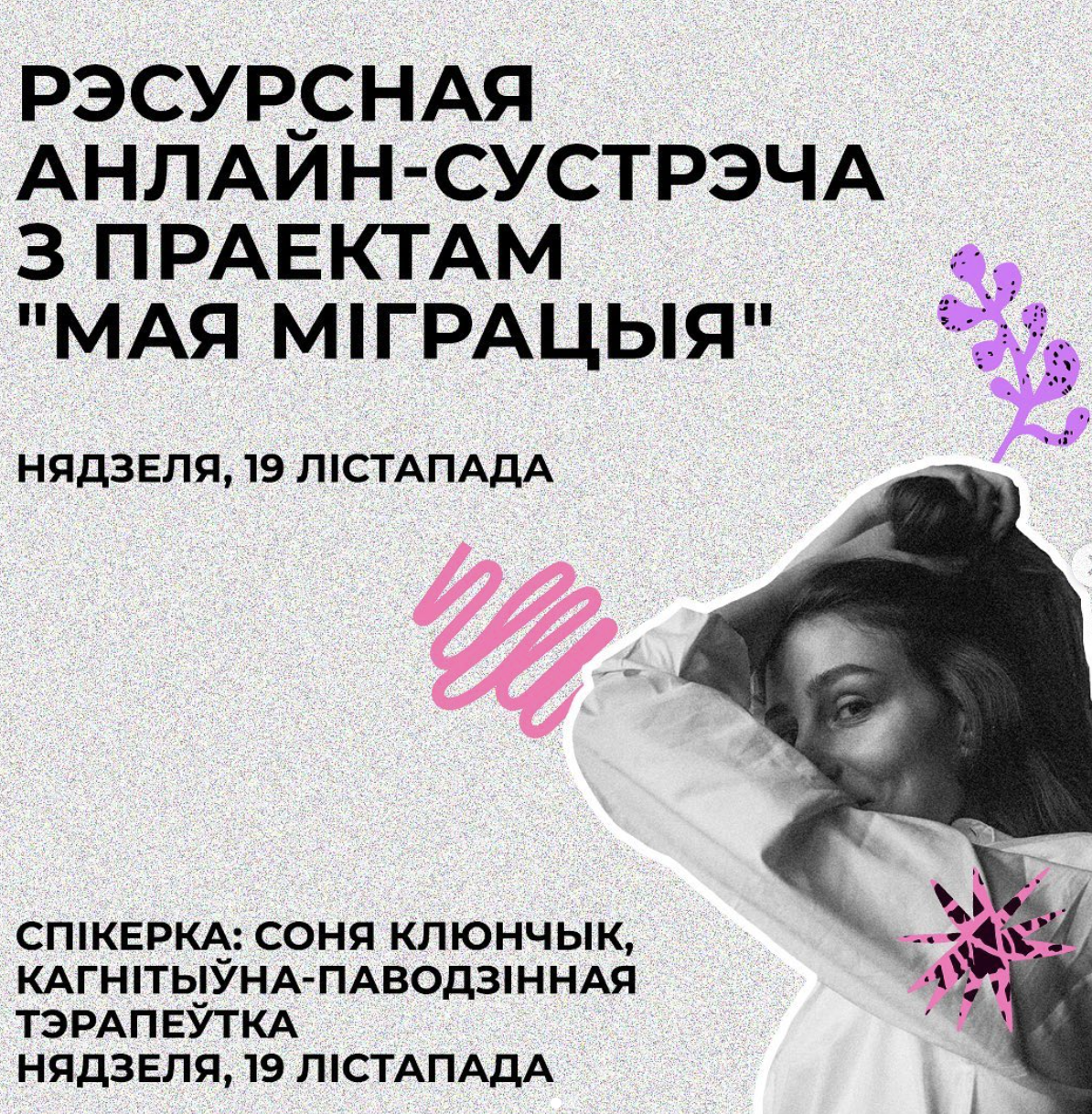 Праект Мая міграцыя запрашае на рэсурсную анлайн-сустрэчу, каб паразмаўляць пра спосабы самападтрымцы ў эміграцыі. Разам з запрошанай спецыялісткай Соняй Клюнчык, кагнітыўна паводніцкай тэрапеўткай, на сустрэчы будзе абмяркоўвацца псіхалагічны бок выклікаў, з якімі мы сутыкаемся ў выгнанні, і практыкі, якія дапамагаюць нам адаптавацца ў новай краіне.