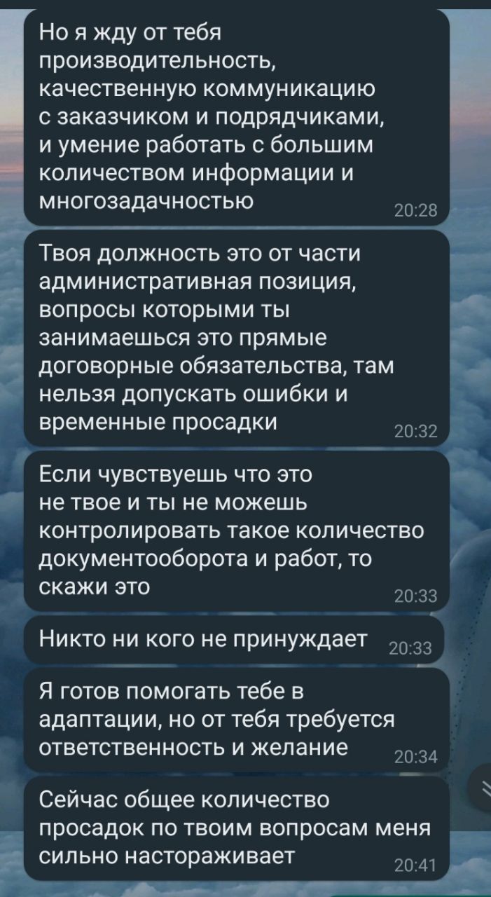 Логично и закономерно, жизнь ударила меня ебальником в дно, когда во время разгорающегося кризиса среднего возраста меня настиг жёсткий синдром отмены АД, при этом я находился в ежедневном стрессе на работе (ниже прикрепляю скриншот сообщений, которые я получал от моего руководителя в нерабочее вечернее время почти с первых дней работы). Всё это вкупе образовало то состояние, которое продвинутые психологи называют Экзистенциальным потрясением, или Экзистенциальным кризисом. На самом деле, такое состояние не крах, хотя и самим субъектом оно воспринимается именно как крах. Оно даётся для того, чтобы разорвать порочный круг неверных решений и, в конечном итоге, прожить полную и счастливую жизнь. Это то самое дно, от которого можно и нужно оттолкнуться, чтобы подняться вверх.