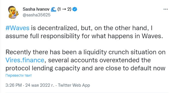 🗓Создатель Waves Александр Иванов пишет, что в протоколе Vires finance возникла ситуация с нехваткой ликвидности, несколько счетов превысили кредитную способность протокола и сейчас близки к дефолту.