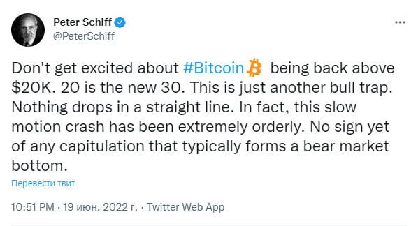 🗓Питер Шифф считает, что пока не было признаков капитуляции, которые свойственны дну медвежьего рынка, поэтому подъем биткоина выше 20 тысяч - это очередная ловушка