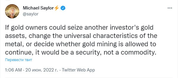 🗓Майкл Сейлор на примере с золотом объясняет, почему биткоин — это товар, а не ценная бумага: