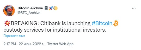 🗓Ситибанк запускает кастодиальный биткоин-сервис для институциональных инвесторов.