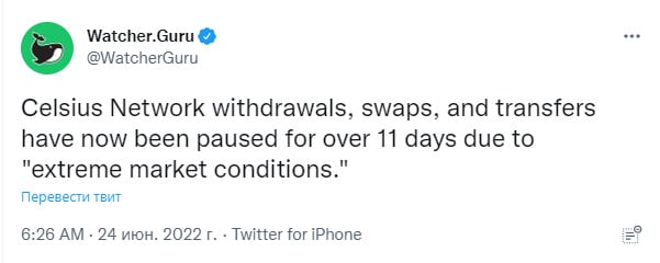 🗓Снятие средств, обмены и переводы в Celsius Network приостановлены более чем на 11 дней из-за «экстремальных рыночных условий»