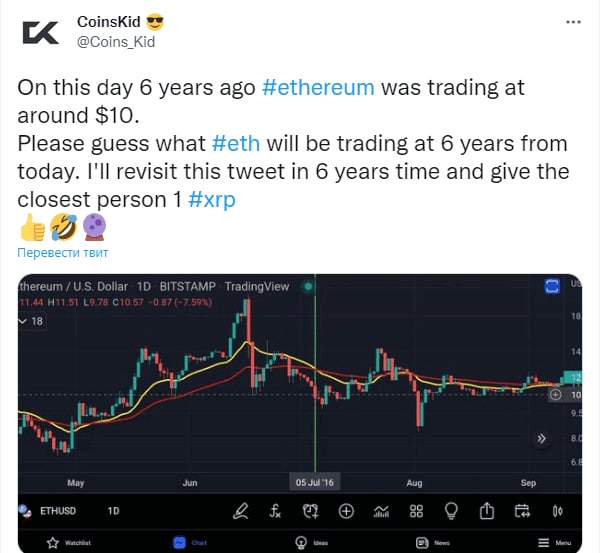 Угадайте, по какой цене Eth будет торговаться через 6 лет с сегодняшнего дня? Я пересмотрю этот твит через 6 лет и передам самому близкому ответу 1 XRP"