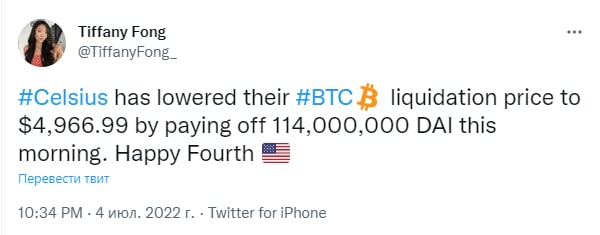 🗓"Celsius снизила свою ликвидационную цену по BTC до $4 966,99, выплатив вчера утром 114 000 000 DAI. Счастливый День независимости!"