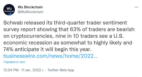 Schwab опубликовали отчет об опросе настроений трейдеров за третий квартал, из которого следует, что 63% трейдеров настроены по-медвежьи в отношении криптовалют, девять из десяти трейдеров считают экономическую рецессию в США весьма вероятной, а 74% ожидают, что она начнется в этом году.