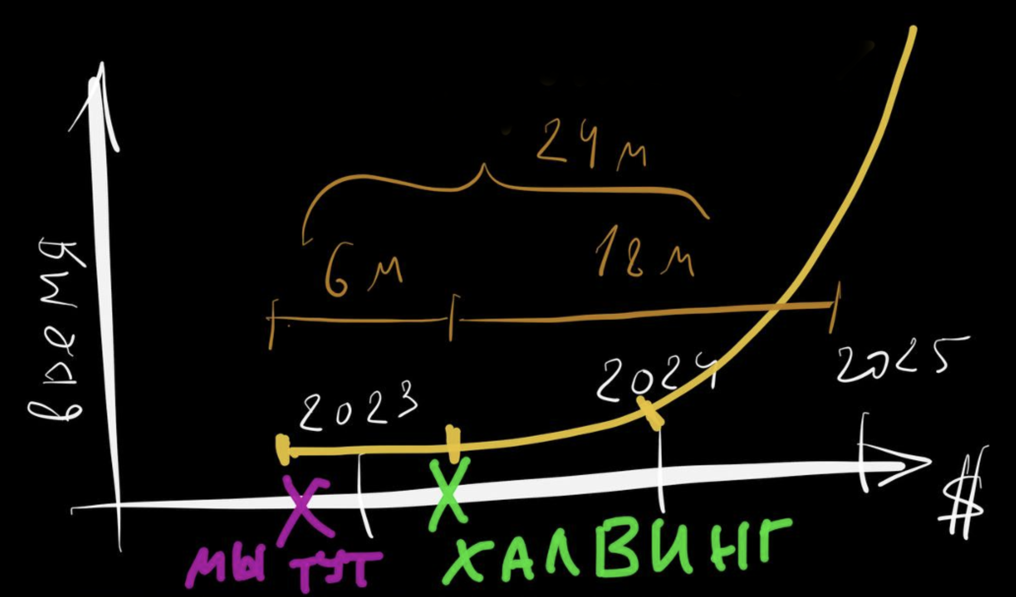 До халвинга осталось 6 месяцев и 18 месяцев после него до максимальной цены.