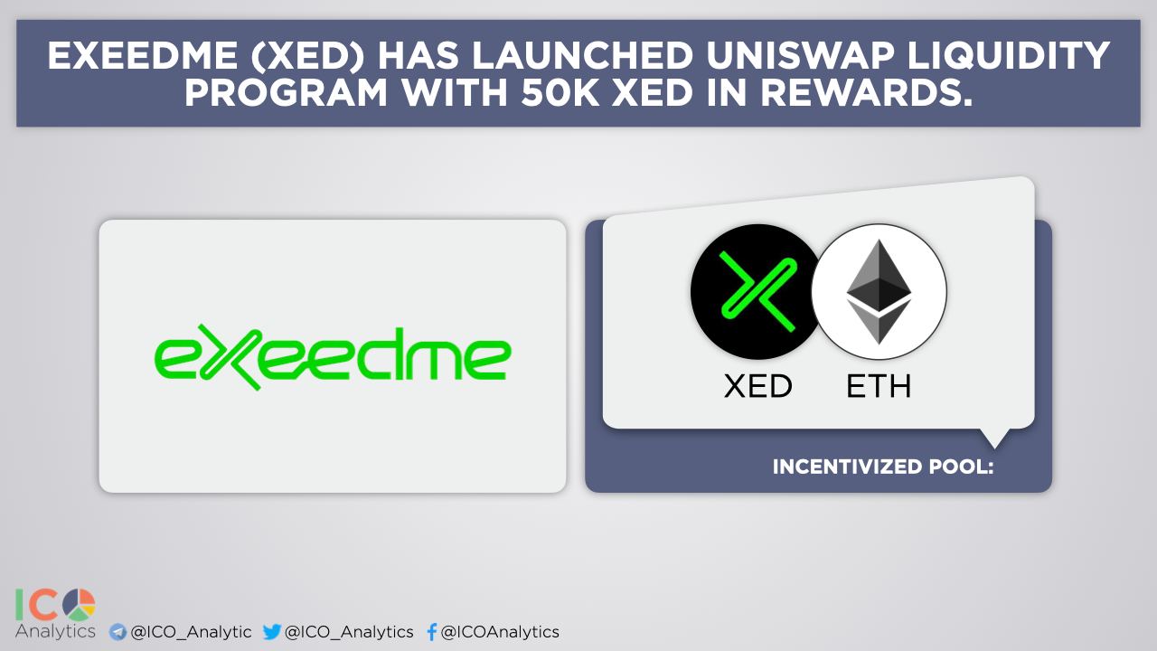 ββExeedme (XED) has launched Uniswap liquidity program with 50k XED In rewards. These rewards are paid in XED to every liquidity provider that locks ETH and XED on Uniswap for at least 30 days.