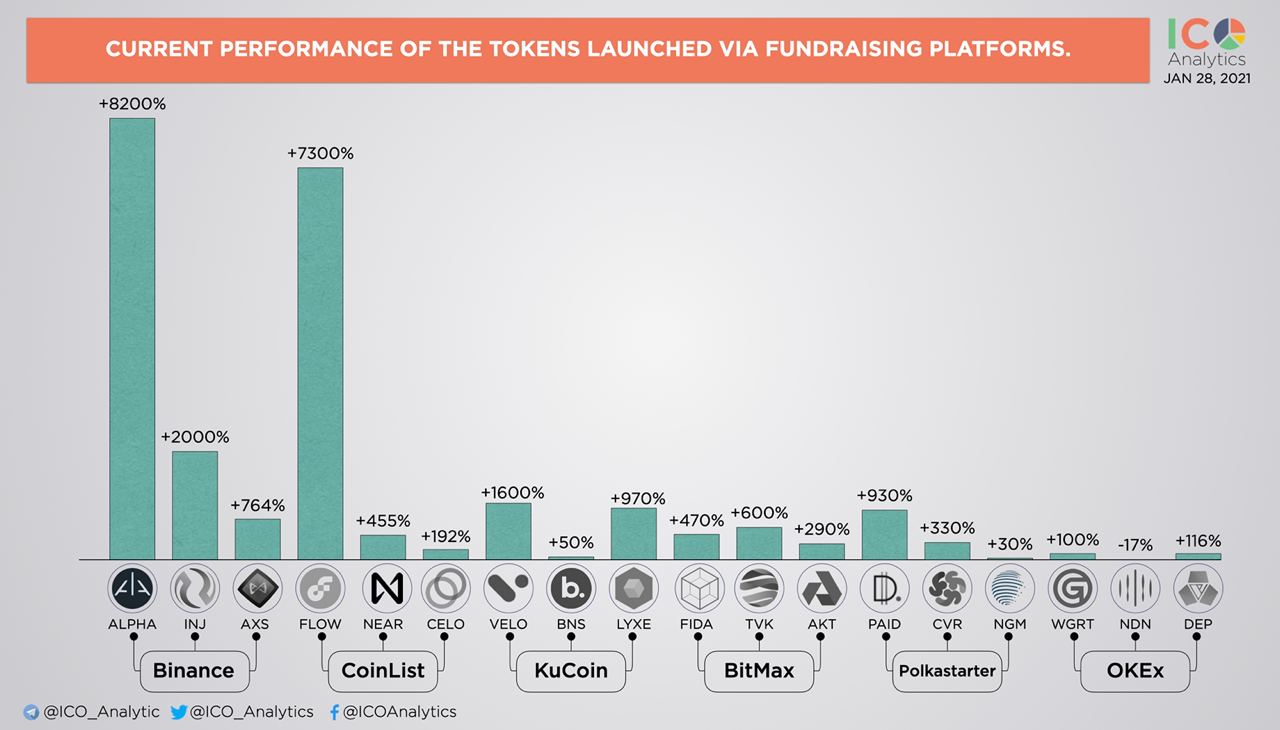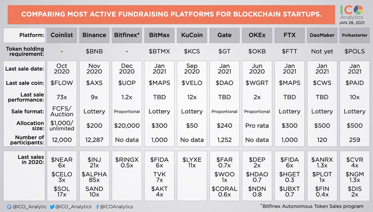 ββComparing current performance of the tokens launched via fundraising platforms. Last 3 token sales on each platform were analyzed.