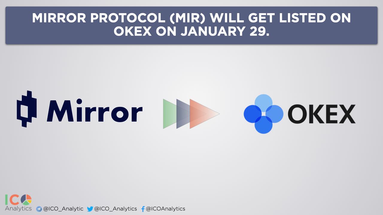 ββMirror Protocol (MIR) will get listed on OKEx on January 29. MIR/USDT trading pair will go live at 12:00 pm (UTC).