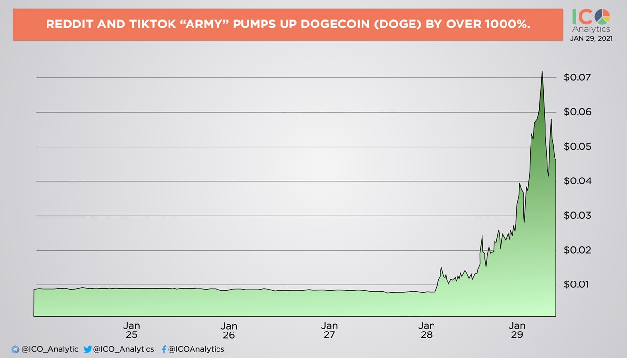 ββReddit and TikTok βarmyβ pumps up Dogecoin (DOGE) by over 1000% to new all time high. Dogeβs resurgence during last day has been due to enthusiasm from Reddit and TikTok users. Previously the same happened with the stock price of GameStop (GME).