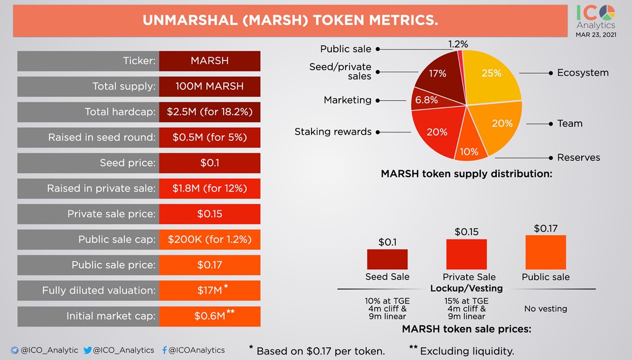 ββUnmarshal (MARSH) token metrics. ββUnmarshal (MARSH) will have a public sale round on Polkastarter on March 30. The whitelisting is live. A Multi-chain DeFi network of indexers will enter the market with $595K initial market capitalization (excluding liquidity).