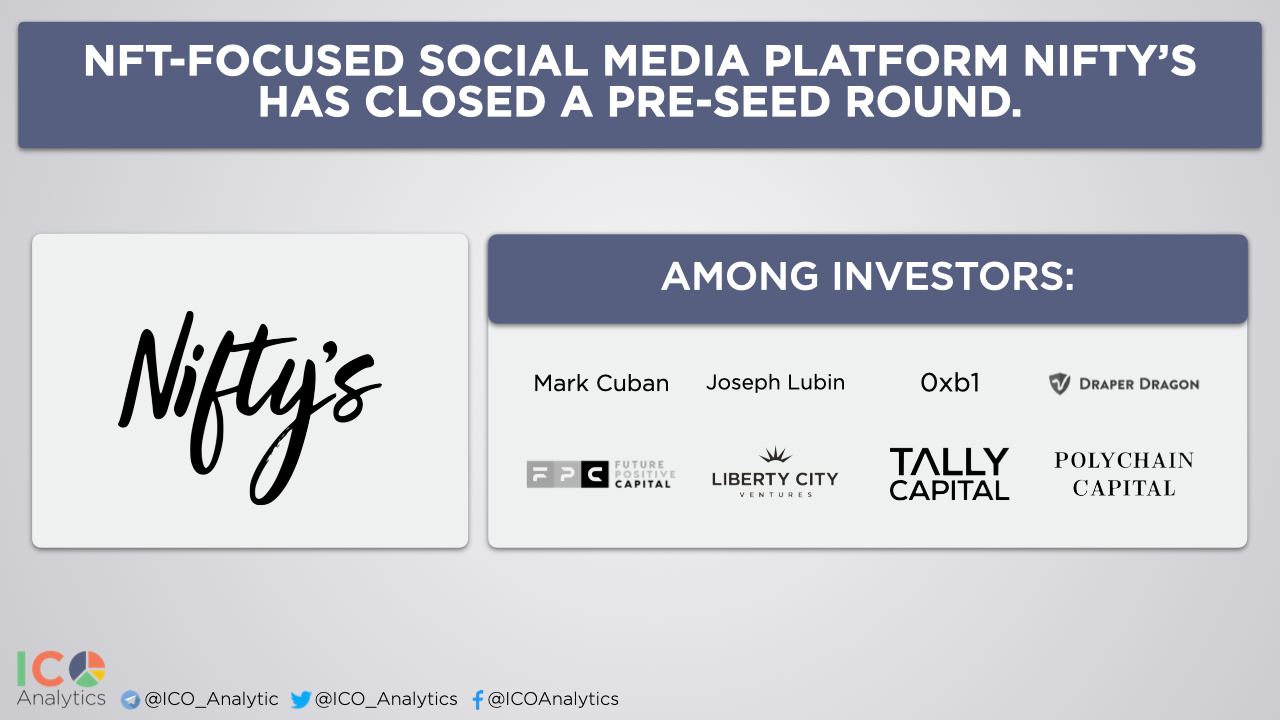 ββNFT-focused social media platform Niftyβs has closed a pre-seed round. Mark Cuban, Joseph Lubin, 0xb1, Draper Dragon, Polychain, Tally Capital, Liberty City Ventures, and Future Positive are among investors.