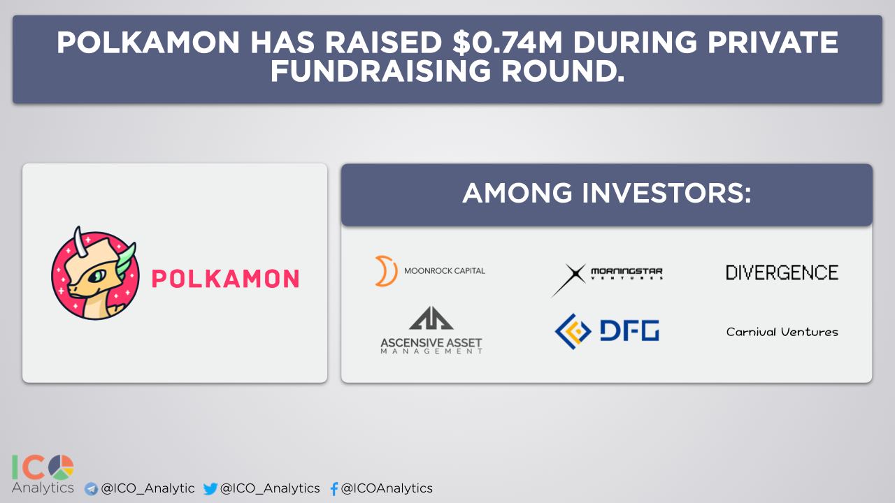 ββPolkamon has raised $0.74M during private fundraising round. Moonrock Capital, Morningstar Ventures, Ascensive Assets, Divergence Ventures, Carnival Ventures and DFG are among participants.