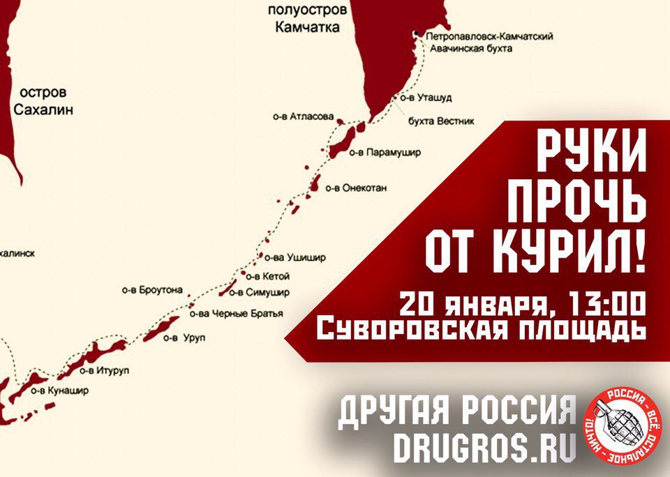 В это воскресенье, 20 января, в Москве пройдёт митинг против возможной передачи Курильских островов Японии. Митинг согласован московской мэрией, он будет проходить на Суворовской площади (в сквере напротив Театра Российской армии). Начало в 13:00.