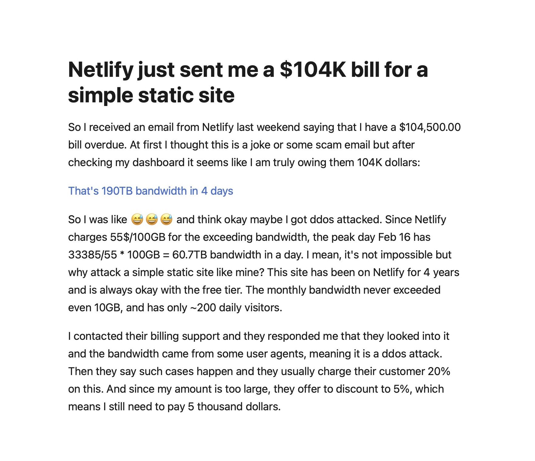 Я хоць і рэкамендую выкарыстанне генератараў сайтаў і ўмоўна бясплатных файлавых хостынгаў, але нават з імі могуць здарацца непрыемнасці. Такая непрыемнасць нядаўна адбылася з адным з карыстальнікаў Netlify, якому выставілі ў разлік $100000 (сто тысяч) за выкарыстанне рэсурсаў сервіса звыш нормы.