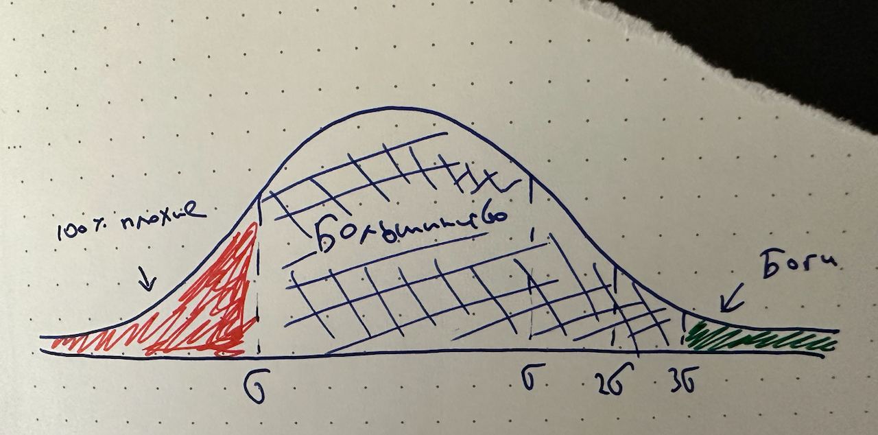 Думаю, если сделать маппинг сотрудников по той же шкале плохой-хороший, то, скорее всего, получится примерно такое же Гауссово распределение как на картинке.
