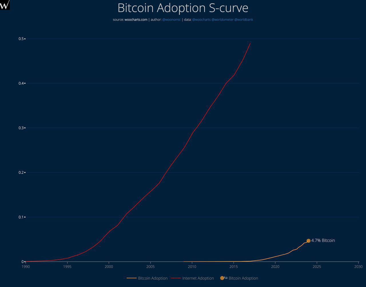Согласно данным CryptoCompare, количество пользователей Bitcoin достигло уровня Интернета в 1999 году. Этот значительный рубеж подчеркивает растущее распространение и принятие криптовалюты.