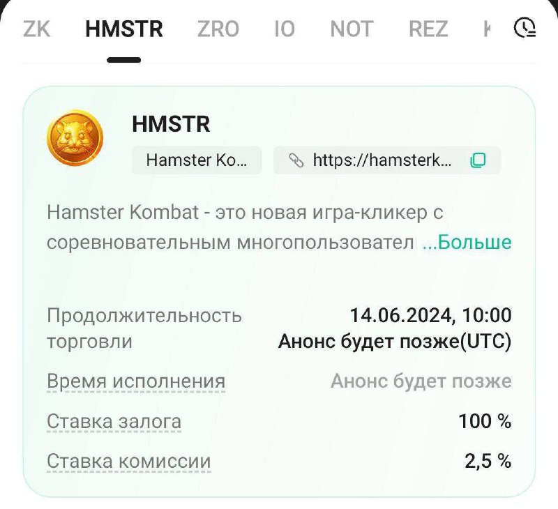 Популярный токен Hamster Kombat (HMSTR) теперь доступен для торгов на премаркете KuCoin. Торги начнутся 12 июня, предоставляя пользователям ранний доступ к токену.