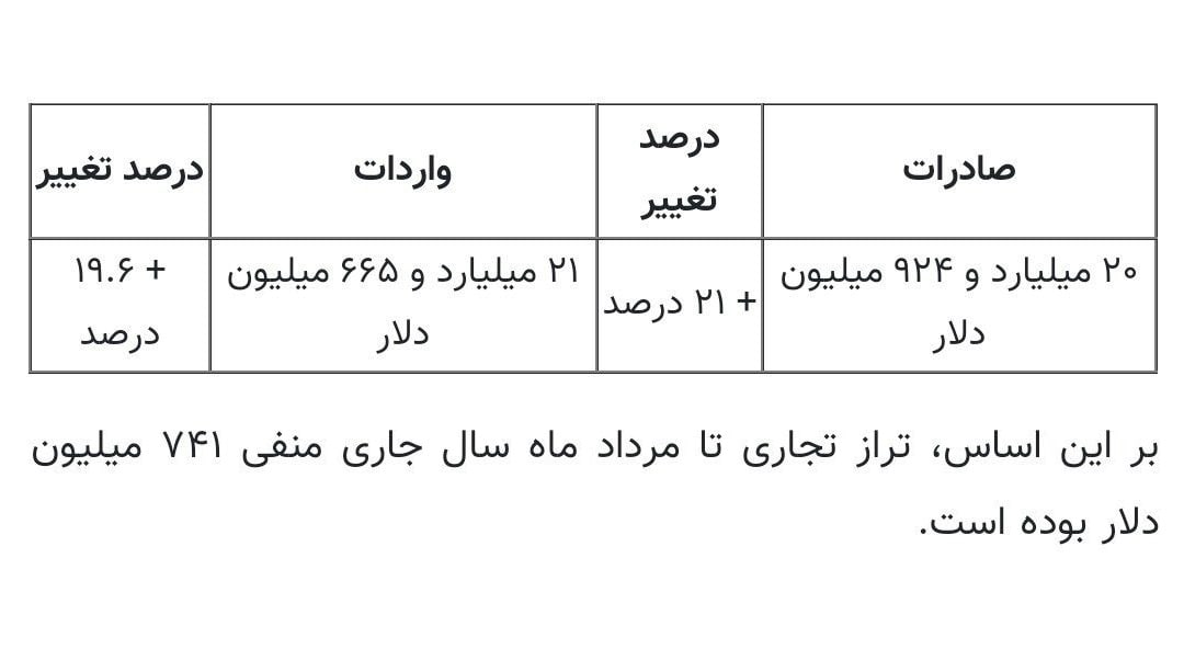 بررسی آمارهای مربوط به تجارت خارجی تا مرداد ماه امسال نشان می دهد که در این مدت ۲۰.۹ میلیارد دلار صادرات و ۲۱.۶ میلیارد دلار واردات داشته ایم که بیانگر تراز تجاری منفی ۷۴۱ میلیون دلاری است.