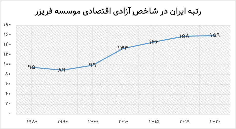جدیدترین گزارش شاخص آزادی اقتصادی موسسه بینالمللی فریز حاکی از قرارگرفتن ایران در رتبه ۱۵۹ام در میان ۱۶۵ کشور بررسیشده توسط این موسسه است که ایران را از نظر آزادی اقتصادی جزو ۱۰ کشور پایین این ردهبندی قرار میدهد.