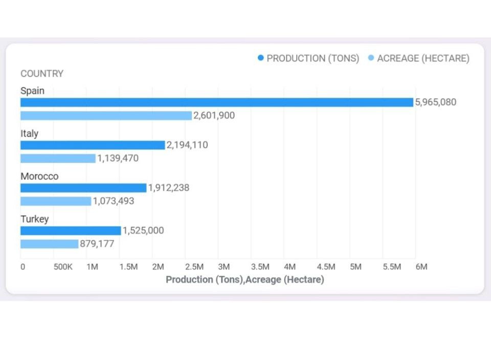 - اسپانیا: اسپانیا بزرگترین تولیدکننده و صادرکننده زیتون و روغن زیتون در جهان است. اسپانیا در سال ۲۰۲۰، حدود ۶ میلیون تن زیتون و حدود ۱.۴ میلیون تن روغن زیتون تولید کرده است. اسپانیا به کشورهای مختلفی از جمله آمریکا، ایتالیا، فرانسه، پرتغال و ژاپن زیتون و روغن زیتون صادر میکند.