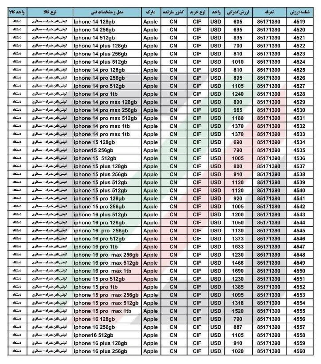 جدول ارزشگذاری گمرکی گوشیهای جدید آیفون برای اولین بار به صورت رسمی توسط گمرک ایران منتشر شده است. این اقدام پس از ابلاغ مصوبه هیئت وزیران در خصوص رفع ممنوعیت واردات آیفون، توسط فرود عسگری (سرپرست گمرک ایران) صورت گرفت.
