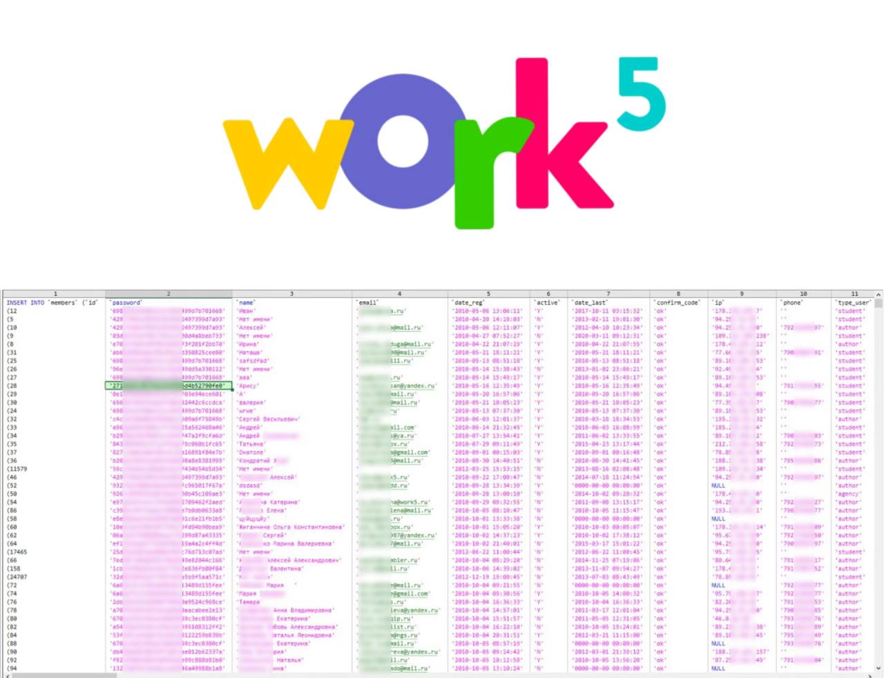 В открытом доступе оказались данные, которые могут иметь отношение к сервису work5, который помогает писать студенческие работы. Сама утечка прошлогодняя – от июня 2022 года, но ранее в пабликах замечена не была. Внутри 2 sql-файла.