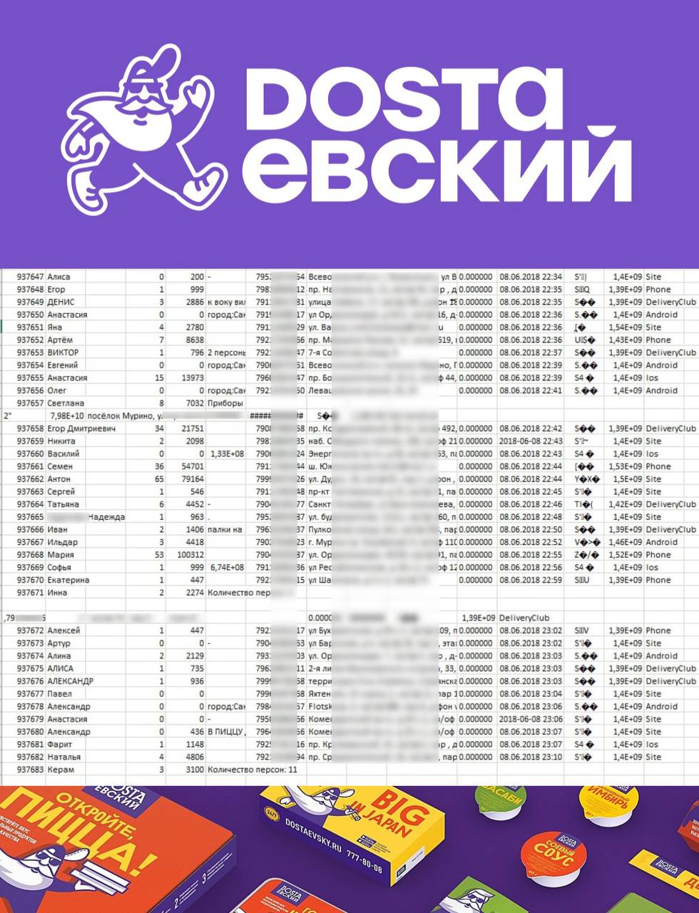 Иностранные хакеры выложили в открытый доступ фрагмент базы на 16 251 строку, предположительно, сервиса доставки еды Dostaевский. Файл содержит информацию об именах клиентов, их телефонных номерах, адресах доставки, email (не везде), позициях и суммах заказа, датах создания заказа.