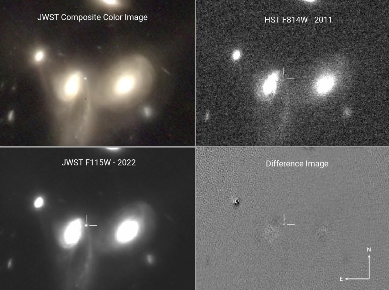 Группа астрономов во главе с Майком Энгессером (Mike Engesser) из Института исследований космоса с помощью космического телескопа сообщила об открытии первого кандидата на роль вспышки сверхновой, найденного при помощи «Джеймса Уэбба». Транзиент был найден при сравнении снимков неба, полученных прибором NIRCam «Джеймса Уэбба» в ближнем инфракрасном диапазоне, и архивных изображений камеры ACS космического телескопа «Хаббл» — его не было на снимках в 2011 году, однако источник излучения есть на снимках, полученных летом 2022 года.