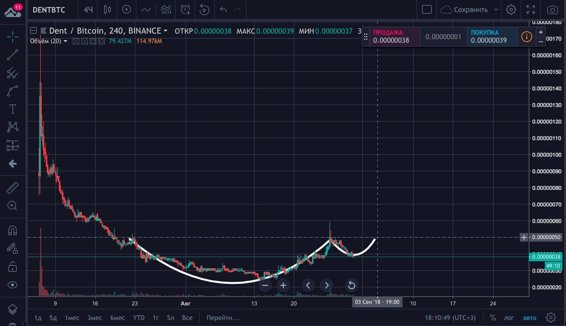 На графике мы видим практически сформировавшуюся чашку с ручкой. Фигура формировалась чуть больше месяца и выглядит как в учебнике. В дополнение к этому у платформы намечно 3 события на ближайшее время: Запуск iOS и Android приложений, запуск DENT Exchange и новые маркетинговые партнерства.