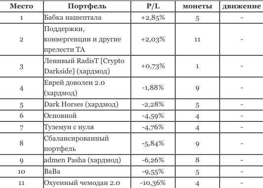 Прием портфелей завершен и сегодня мы уже "снимали" результаты первого дня битвы. Победитель прошлой битвы с портфелем "Поддержки, конвергенции и другие прелести ТА" занимает второе место. А на первое место вышел портфель под названием "Бабка нашептала" с профитом в +2.85%. Есть у нас и хардмод (без стейбл коинов и монет из ТОП20), в котором админы идут пока ноздря в ноздрю. Чуть позже мы добавим страницы с описанием для каждого портфеля, а пока можете зайти на Официальную страницу битвы и получить ссылки на портфели.