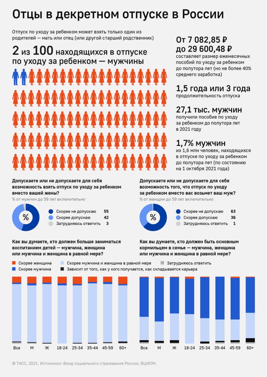 Вчера, 17 октября, в России впервые отметили День отца. Указом президента учрежден новый праздник, который будут отмечать каждое третье воскресенье октября. Сегодня в отпуск по уходу за ребенком ходят не только мамы, но и папы. Декретный отпуск может оформить один из родителей или родственник. Кроме того, если ребенок заболеет, отец также может взять больничный вместо матери. Больше половины работающих мужчин исключают возможность уйти в декрет, однако двое из ста все же берут отпуск по уходу за ребенком. Статистика о декретном отпуске отцов и их отношение к потенциальной возможности взять такой отпуск — в инфографике ТАСС.