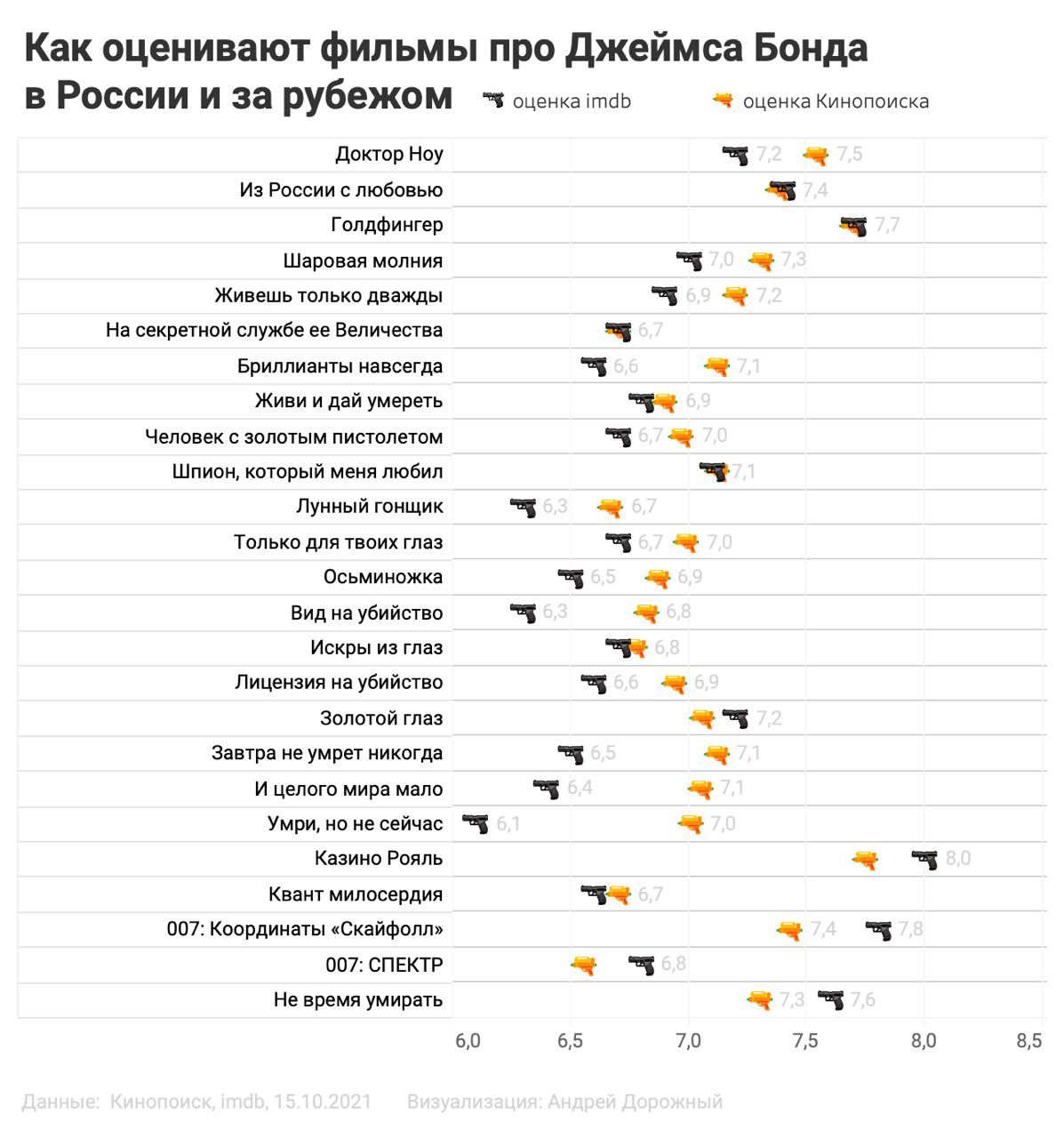 Проанализировал оценки фильмов о Джеймсе Бонде на Imdb и Кинопоиске. Наши зрители любит старые фильмы, а западные тащатся от Крейга. Видимо, мы больше склонны к ностальгии и гротескным героям.