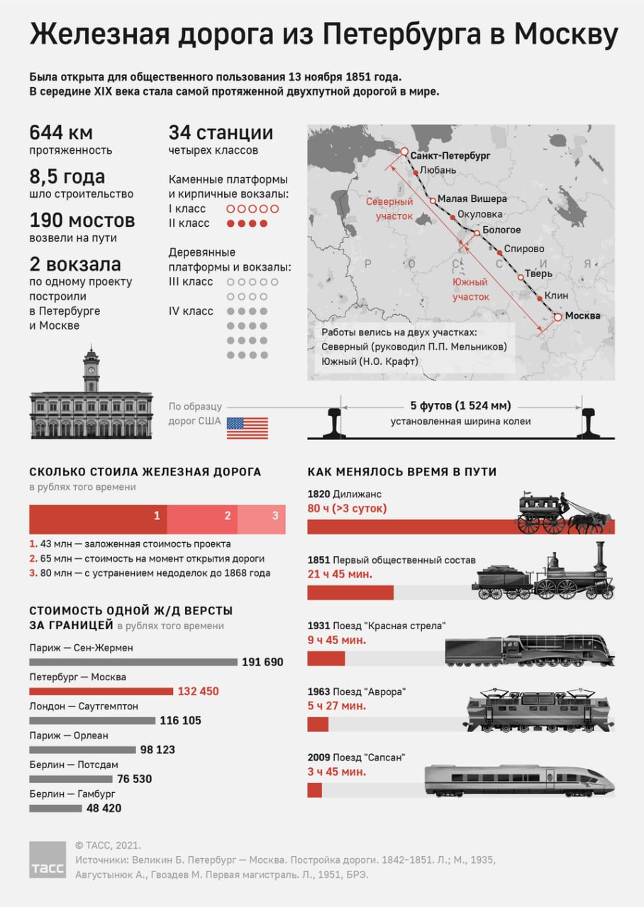По указу Николая I в 1842 году началось проектирование и строительные работы. Строительство железнодорожного пути из Санкт-Петербурга в Москву заняло восемь с половиной лет. 13 ноября 1851 года состоялось официальное открытие всей магистрали. Во сколько обошлось строительство дороги и как сократилось время в пути — узнайте в инфографике ТАСС.