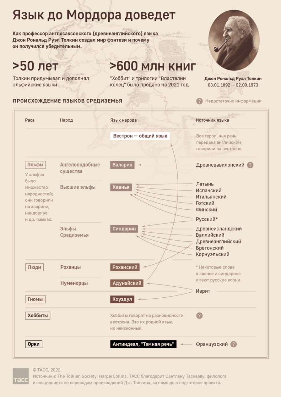 3 января исполнилось 130 лет со дня рождения Джона Толкина, которого называют отцом современного фэнтези. Его Средиземье, мир, населенный расами выдуманных существ — хоббитами, эльфами, гномами, — кажется почти реальным из-за детальной продуманности истории и языка каждого народа. О том, какие реальные языки легли в основу выдуманных в самых известных произведениях Толкина, — в инфографике ТАСС.