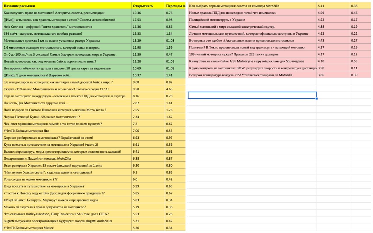 Полная инфографика на прикрепленном фото внизу ( в желтой зоне присутствует +- такая же логика распределения, в красной - крайне мало рассылок, которые можно отнести к пунктам описанным выше). Таблица отсортирована “по убыванию” процента открытия.