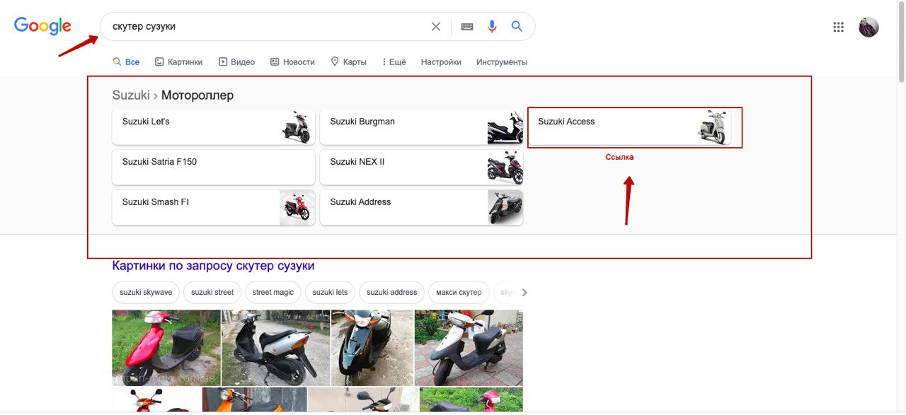 Гугл не стоит на месте🧐. Я не знаю как это назвать, расширенные результаты, быстрые ссылки, первый раз такое вижу. При вводе запроса “скутер сузуки” в выдаче гугла появляется блок со ссылками, в котором перечислен модельный ряд скутеров сузуки.