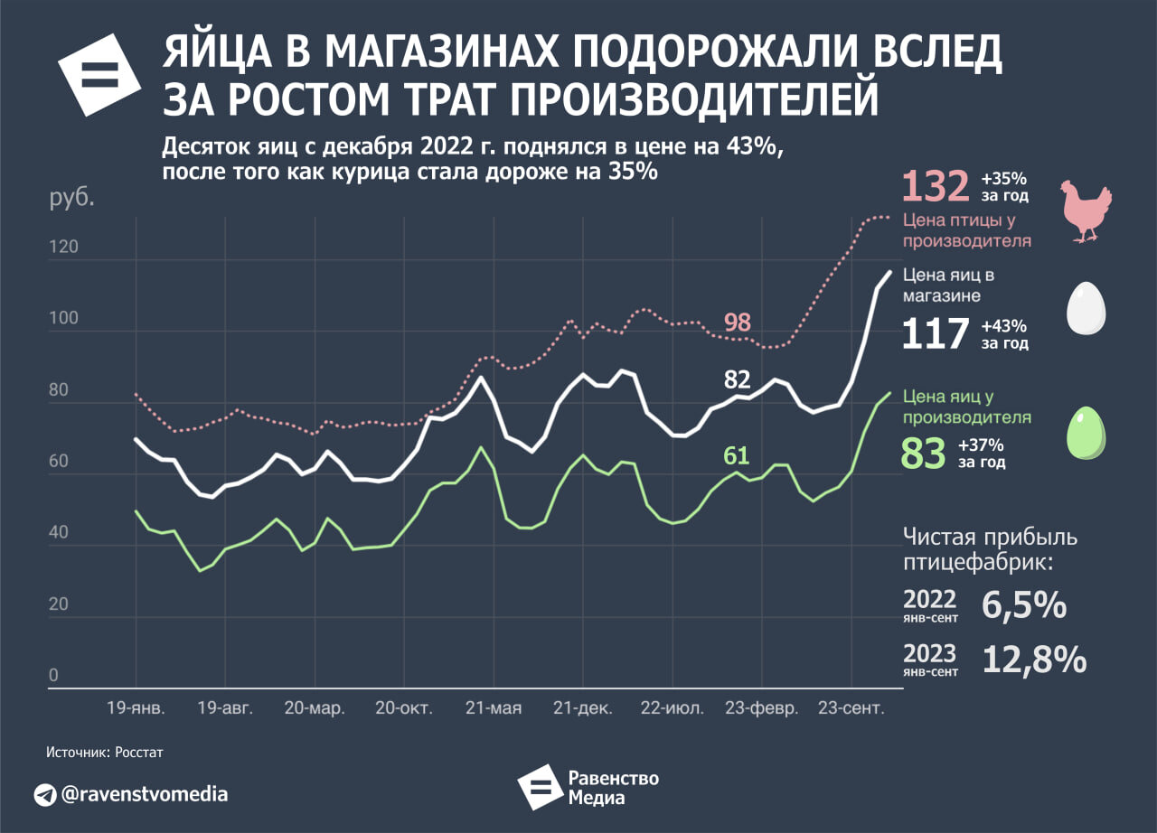 С объемом предложения все стабильно. Поголовье птицы на нояб. 2023 г. было 458 млн (годом ранее – 460 млн). Производство яиц в янв-нояб 2023 г. выросло на 2%, составив 34,8 млрд. В частности в ноябре произвели 3,1 млрд яиц (всего на 0,2% меньше, чем в нояб. 2022 г.). То есть не спад выпуска подстегнул рост цен.