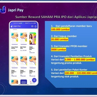 3️⃣. Dengan membeli Paket Konter minimal Rp. 1.000.000, maka Anda akan mendapatkan DIVIDEN dari saham Anda ketika sudah waktunya pembagian Dividen saham dimulai. Untuk pengguna yang memiliki saham Pra IPO Japri Pay namun tidak membeli paket minimal Rp. 1.000.000, maka tidak berhak atas Dividen sahamnya, hanya bisa jual sahamnya ketika sudah IPO.