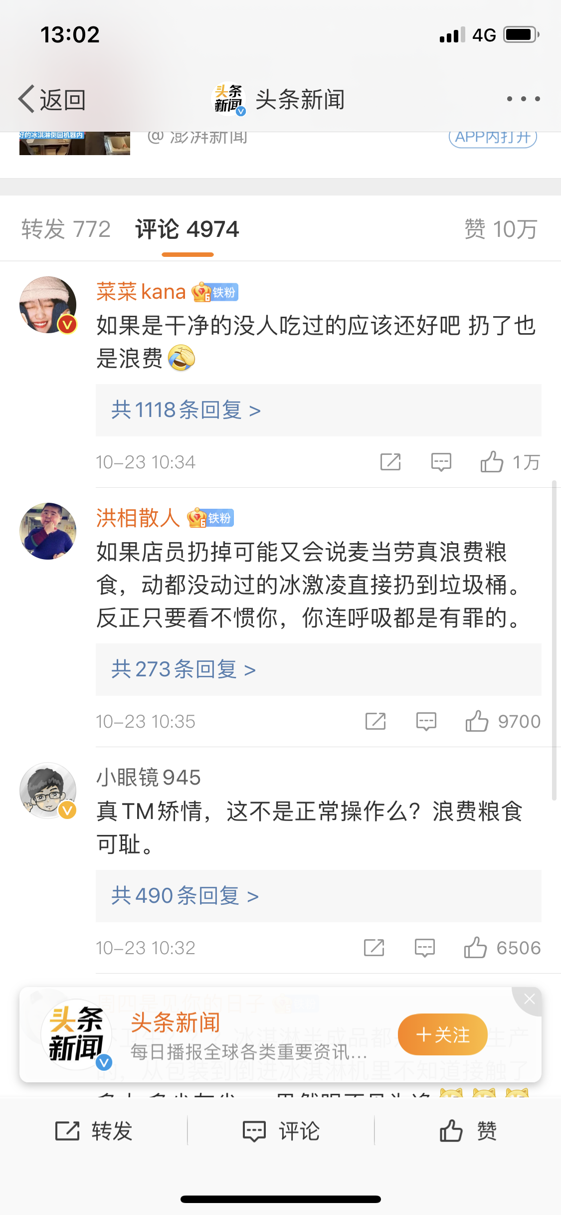 微博上有个热搜,是说麦当劳员工把打出来没人要的冰淇淋又倒回机器里了,被控诉不卫生。