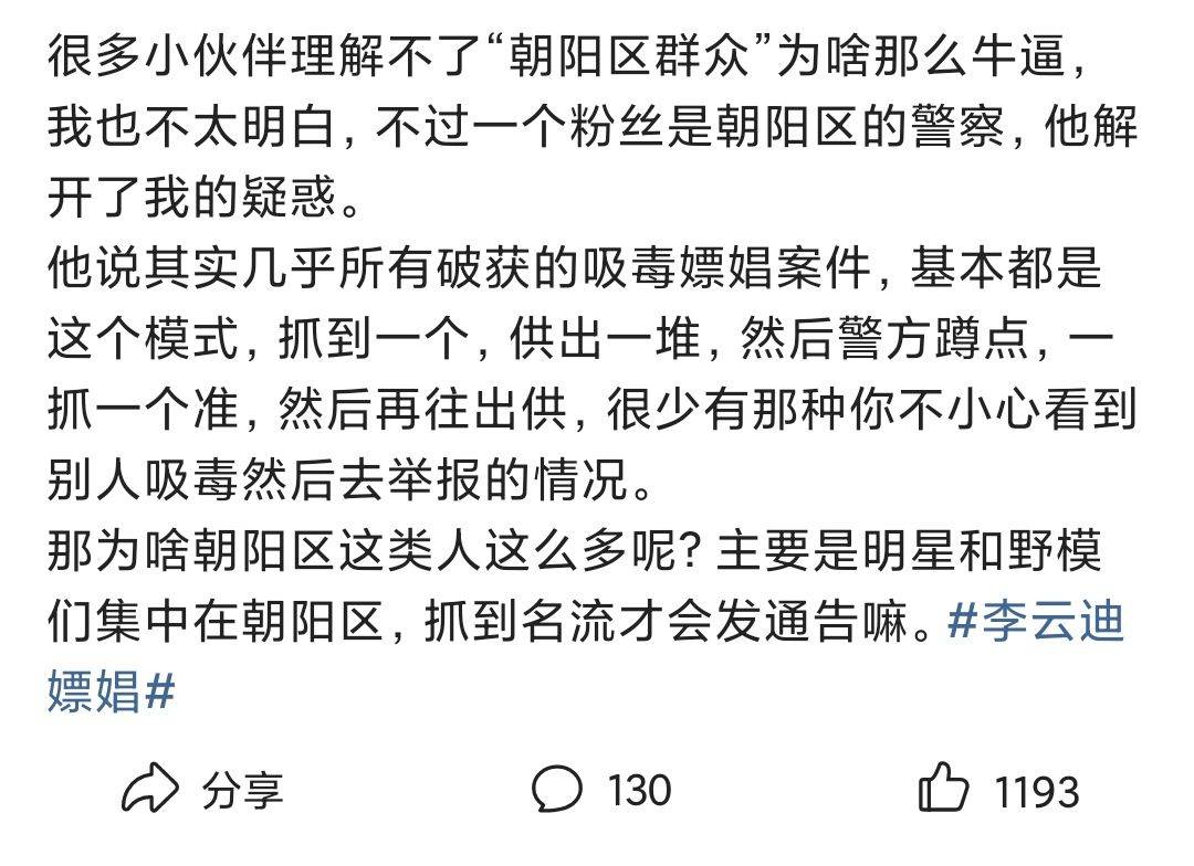 有自称知情人曝光了李云迪嫖娼被抓的细节,他称是在北京三里屯附近的一个小区抓到的窝点儿,卖淫的女子对自己从事的勾当供认不讳,于是从她的手机中查到了钢琴家李云迪的联系方式,了解到李云迪21日由首都机场T2回京,下了飞机后便被抓了,进去后便承认了,每次嫖娼还是实名制的转账,每次消费一万元。